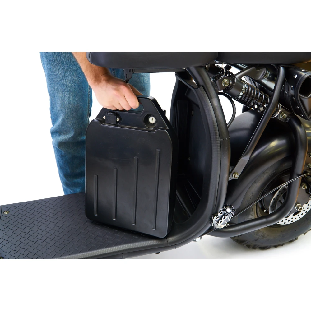 Мощность 2000 Вт электро-скутера делает его не заменимым видом транспорта, как в городе, так и вне его. Максимальная нагрузка 200 кг., второе сидение, позволяет перевозить пассажира и дополнительные грузы. Наличие аккумулятора 20Ah даёт продолжительность хода на одном заряде до 50 км. Время полной зарядки 4-5 ч. Дисковые тормоза на оба колеса и передние и задние амортизаторы делают электро-скутер комфортным видом передвижения.