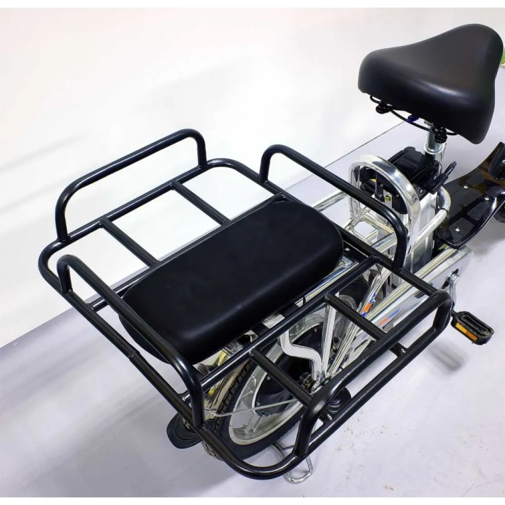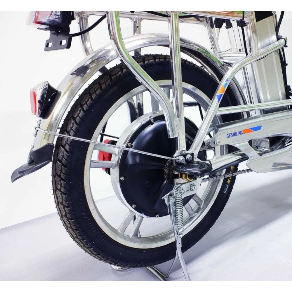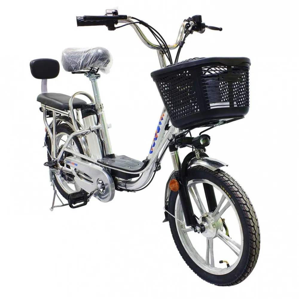 Электровелосипед весом 32 кг имеет максимальную грузоподъемность 180 кг. Техника представлена нескладной конструкцией, изготовлена из прочного и облегченного алюминия. Мощность двигателя 350 Вт позволяет в короткие сроки развивать максимальную скорость 35 км/час. Комфортное движение на любой дороге обеспечивают оригинальные передние амортизаторы. Аккумуляторная батарея рассчитана на 700 циклов заряд/разряд, позволяет преодолевать расстояние 50 км на одном заряде. Задние гидравлические тормоза и передние барабанные продуманы производителем для обеспечения полной безопасности поездок.
