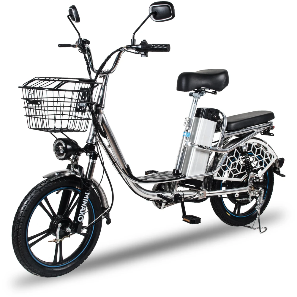 Велогибрид Minako V8 Pro идеально сочетает в себе комфорт и большую дальность хода, скорость и практичность. Приписка + 15 Ah в названии модели означает, что в комплекте к велосипеду идёт дополнительный аккумулятор ёмкостью 15 Ач. Вместе со штатным аккумулятором ёмкостью 12 Ач они обеспечивают запас хода до 100 километров.