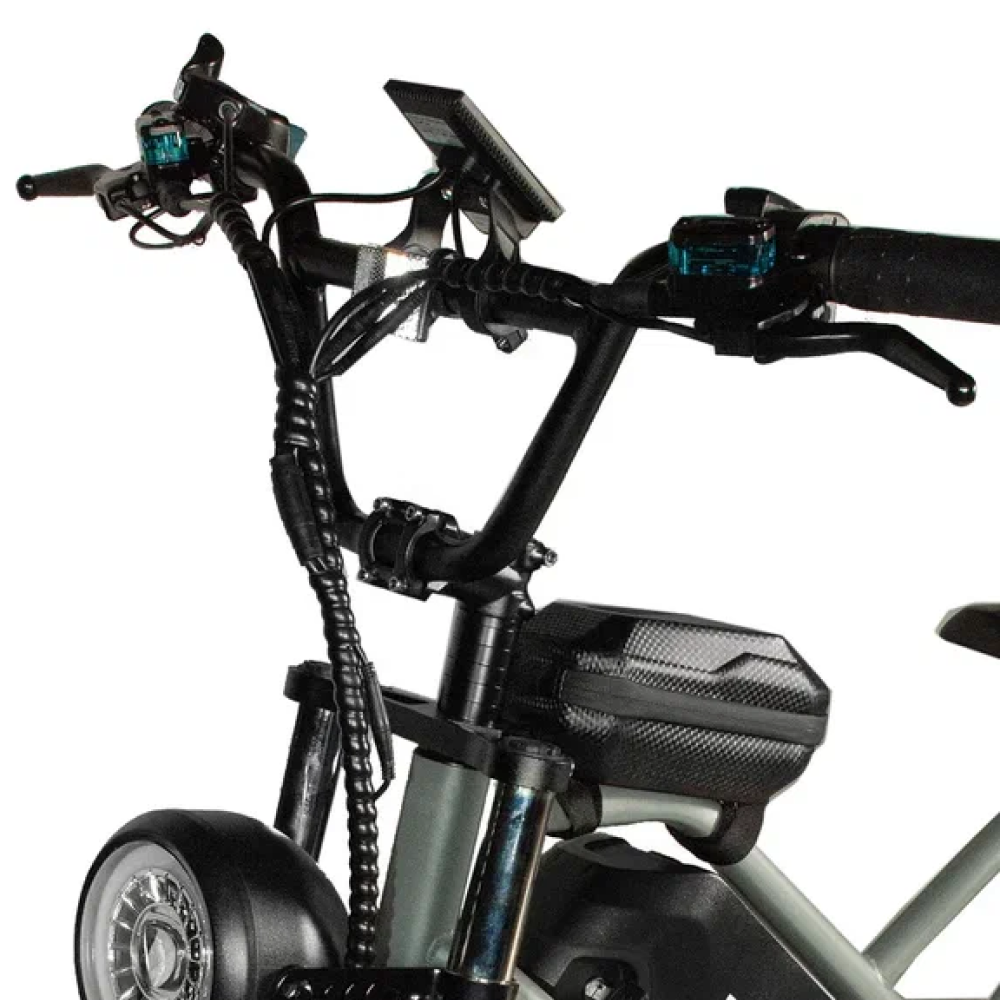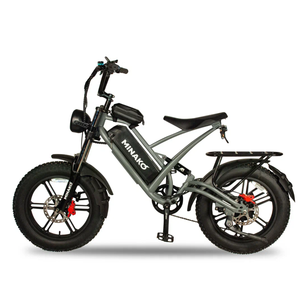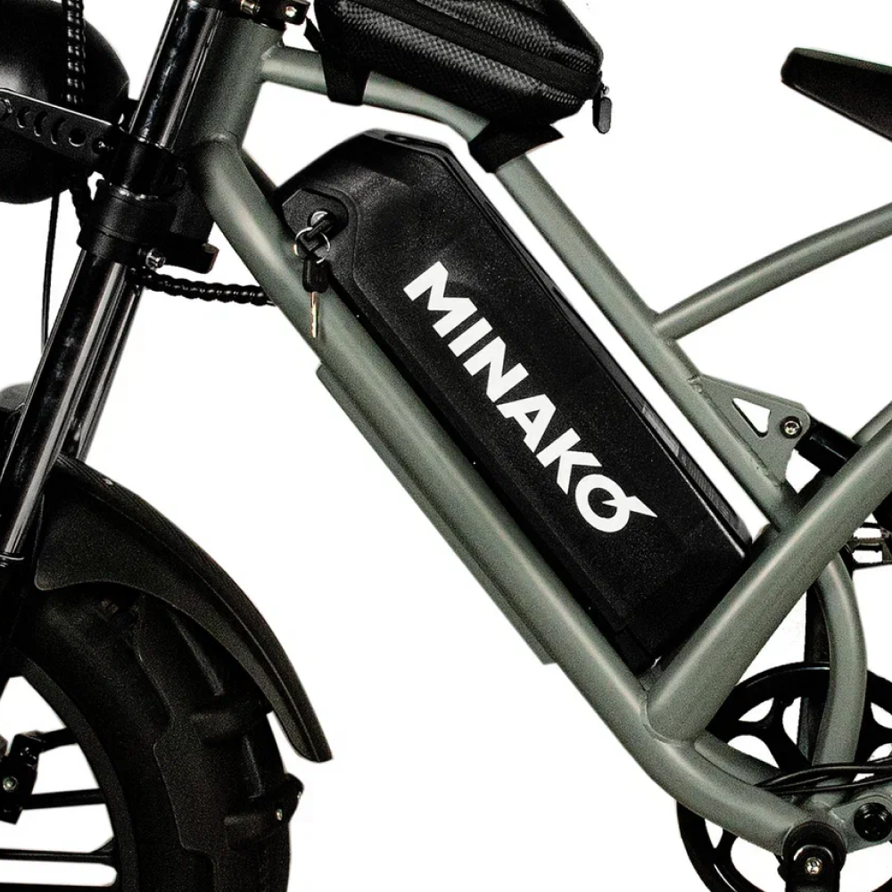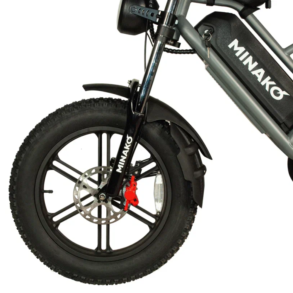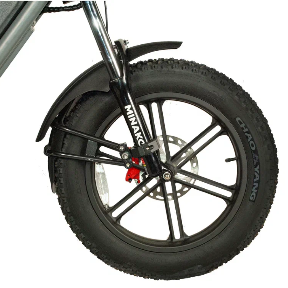 Серебристый электровелосипед Minako FOX (23Ah) - это сила и стиль, воплощённые в металле. С литыми дисками и внедорожными покрышками размером в 20 дюймов, он создан для тех, кто не боится скорости и предпочитает действовать, а не ждать. С максимальной скоростью до 55 км/ч и мощностью в 1000W, Minako FOX позволяет вам наслаждаться свободой движения на расстоянии до 60 км на одном заряде. Дисковые гидравлические тормоза обеспечивают безопасность, а уникальный дизайн, напоминающий питбайк, в сочетании с мотоциклетной вилкой и большой фарой, делают его неповторимым. Велосипед оснащён сумкой и багажником, который можно использовать как сиденье для пассажира. Амортизатор закрытого типа сзади и стоп-сигнал дополняют функционал этого уникального электровелосипеда.