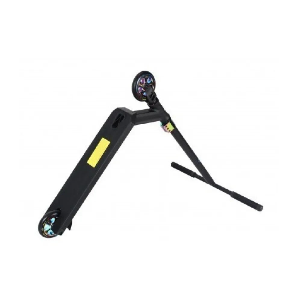 Главным достоинством трюкового самоката является улучшенная компрессия HIC и вилка из облегченного алюминия. Форма руля Т-образная, изготовленная из прочной стали и имеющая идеальные параметры 570*590 мм. Дека 505*120 мм и футспейс 350 мм доказали свою безопасность и эффективность при длительных заездах. Колеса 110 мм из надежного полиуретана прочно закреплены.