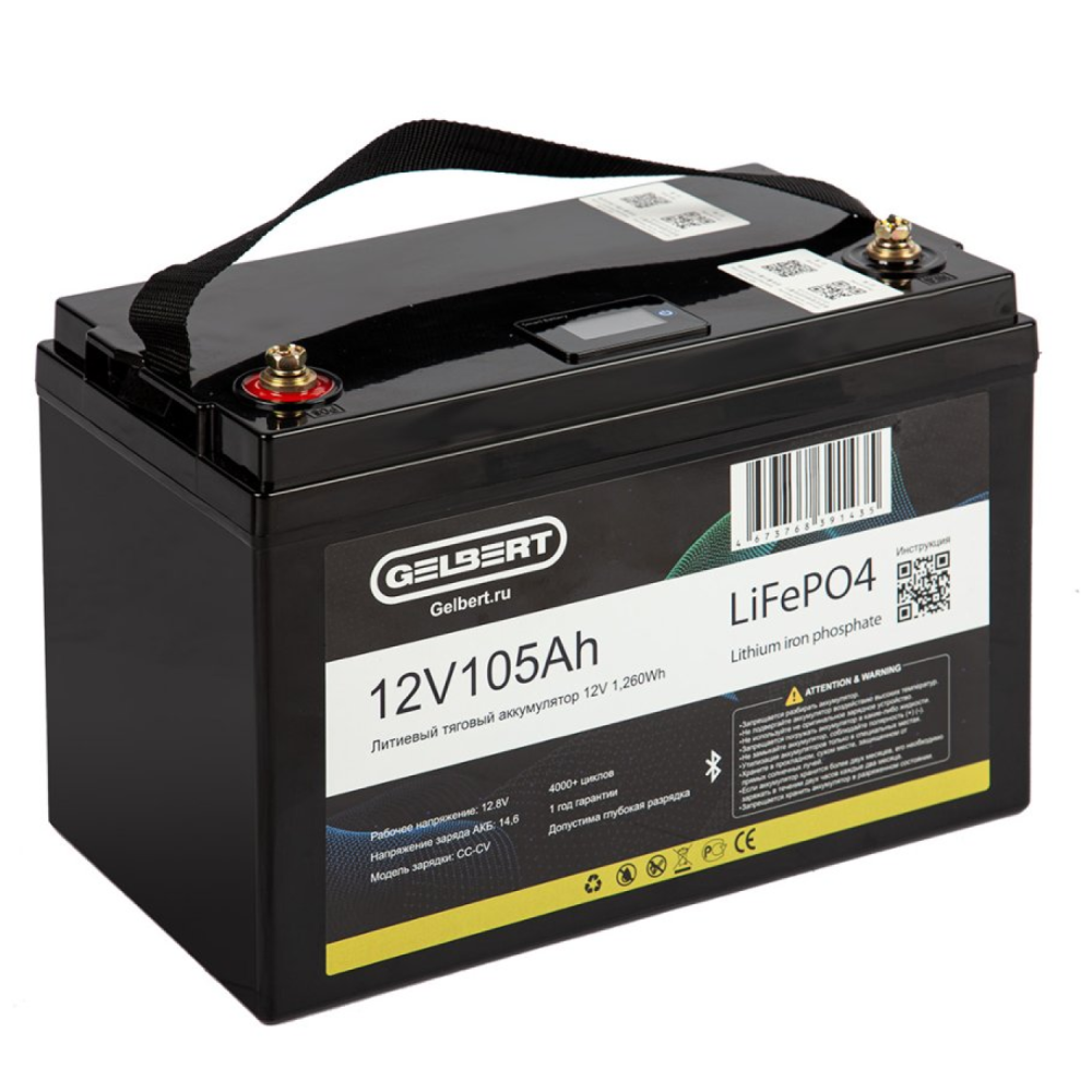 Аккумулятор литиевый тяговый Gelbert LiFePO4 (12V/105Ah/100А/1,260Wh) Bluetooth